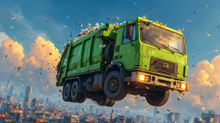 A green garbage truck floats mid-air over a city skyline, scattering trash and defying gravity in a surreal cartoonish visual.