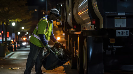 Garbage collector cleaning trash in the city at night. Recycling concept.