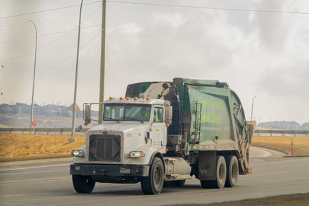 Calgary, Alberta, Canada. Apr 04, 2023. A green garbage recycling and composting truck.