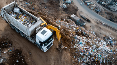 Aerial view of a heavy-duty garbage truck collecting waste at a large landfill site, with an excavator in operation on debris, showcasing an urban environment.