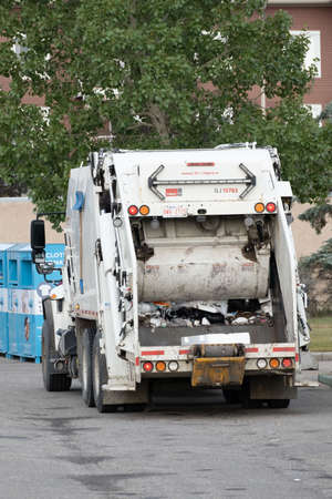 August 21 2021 - Calgary , Alberta Canada - Garbage truck collecting rubbish from bins