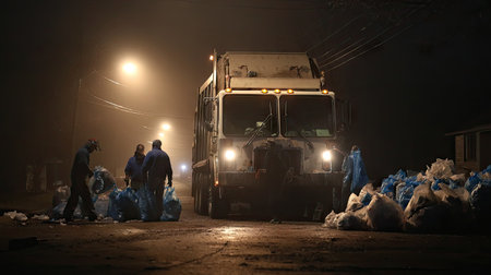 A foggy night scene captures workers collecting garbage bags from the street, surrounded by blue plastic covering, alongside a sanitation truck.