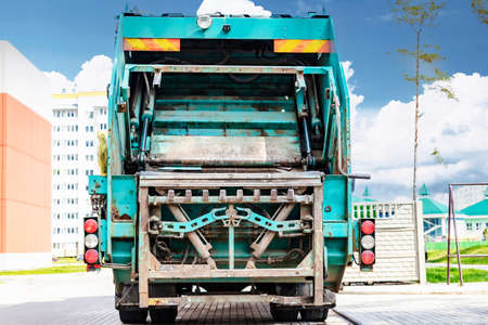 A garbage truck picks up garbage in a residential area. Loading mussar in containers into the car. Separate collection and disposal of garbage. Garbage collection vehicle