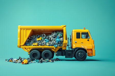 A yellow dump truck is filled with trash. The truck is on a blue background. The trash is scattered all over the truck