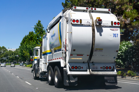 July 11, 2019 Sunnyvale / CA / USA - Specialty Solid Waste & Recycling (SSWR) vehicle driving on a street; Specialty is providing garbage hauling and recycling services to local residents and business