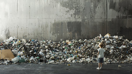 Child overlooking a polluted landfill in a city with sky clouds during sunset