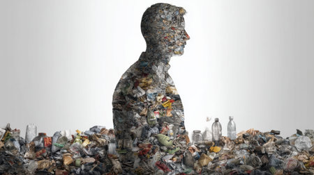 Human silhouette overflowing with garbage illustrates the consequences of consumerism, highlighting the urgent need for sustainable practices in modern society.