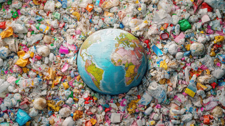 A globe rests amidst a chaotic mass of trash, representing the urgent need for environmental action against plastic waste and pollution.