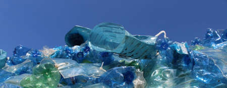 Crumpled plastic bottles on a blue background. Plastic trash.