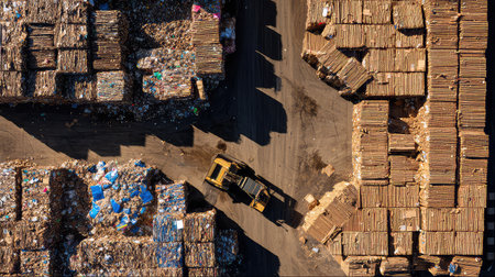 This aerial photograph depicts a large waste management facility, showcasing stacks of recycled materials and machinery actively processing waste.