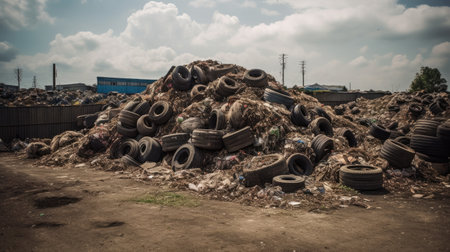 Temporary Waste Disposal Area with Piled Tyres and Debris under Cloudy Sky
