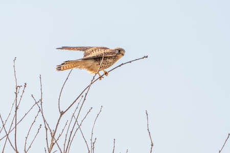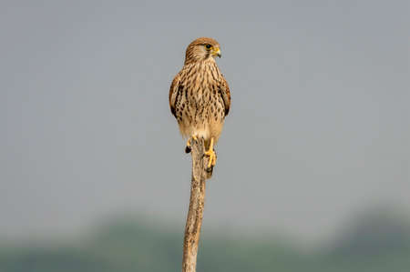 Common kestrel or european kestrel or Falco tinnunculus bird portrait perched on branch during winter migration at Blackbuck National Park Velavadar gujrat india asia