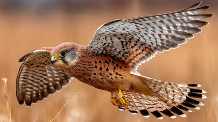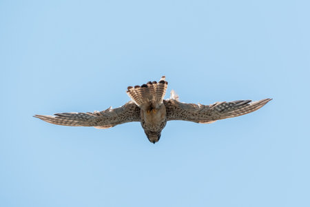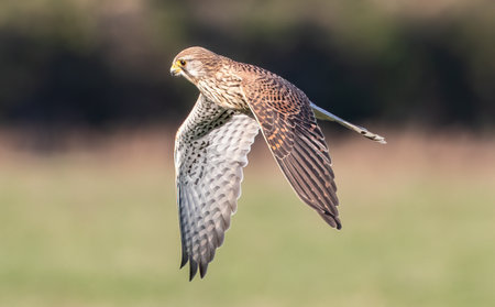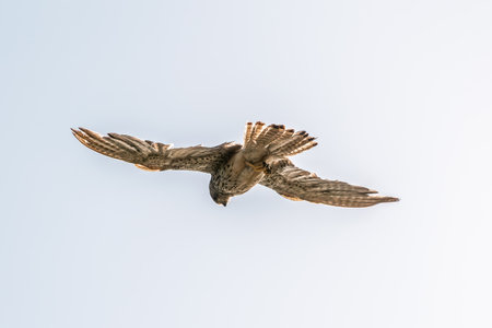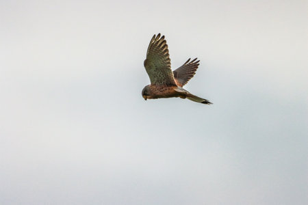 Male kestrel bird of prey, Falco tinnunculus, in flight hunting for prey