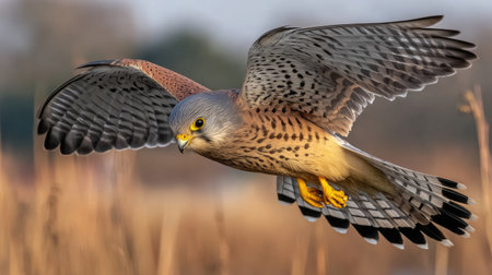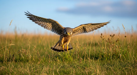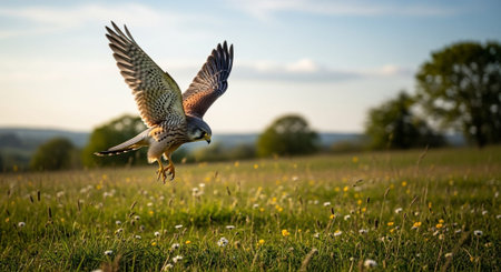 A peregrine falcon soaring in the air above a field on a sunny day with blurred background