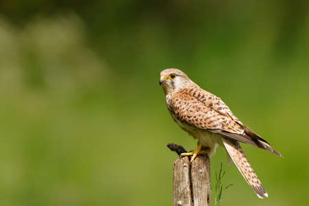 Common Kestrel (Falco innunculus) eating a mouse on a pole in the meadows in the Netherland