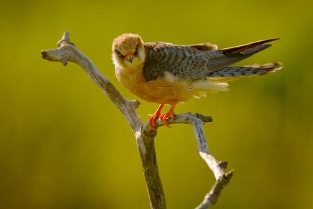 Red-footed Falcon, Falco vespertinus, bird sitting on branch with clear green background, cleaning plumage, feather in the bill, animal in the nature habitat, Hungary.