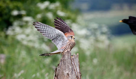 Common Kestrel (Falco tinnunculus).The male bird with his grey head on his final approach to his chosen perch, the post in the foreground.
