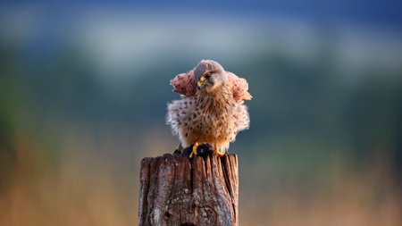 Kestrel bird of prey hovers against a dramatic sky with colorfull blue and purple clouds, hunting for prey. Background, copy space