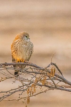 Male common kestrel, falco tinnunculus, sitting on branch in spring nature with copy space. Patterned brown bird of prey observing on bough with beige background. Feathered predator looking on wood in springtime.