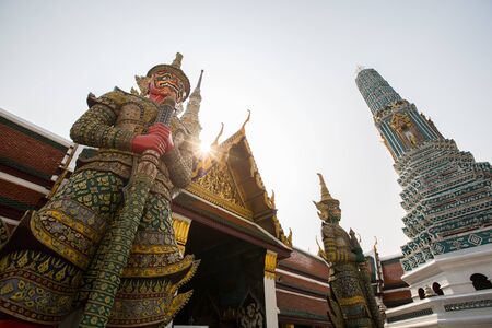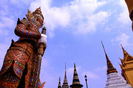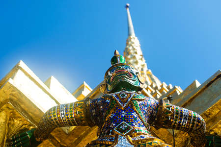 The Giant Demon Guardian with Temple and Blue Sky Background at Wat Phra Kaew, Grand Palace, Bangkok, Thailand.