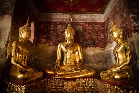 Ancient golden buddha statue in antique old ubosot for thai people travelers travel visit respect pray blessing wish holy worship mystery myth in Wat Mahathat Worawihan Temple in Phetchaburi, Thailand