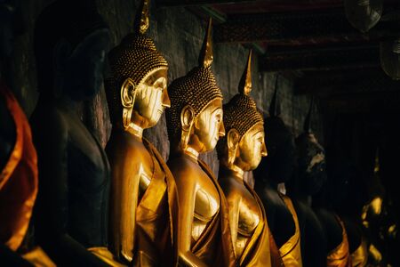 Ancient buddha statue in antique old ubosot for thai people and foreign travelers travel visit and respect praying blessing deity god angel holy worship at Wat Tanot temple in Nonthaburi, Thailand