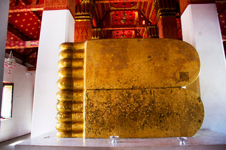 Sculpture and carving foot of buddha reclining attitude statue of Wat Pa Mok Worawihan temple for thai people traveler travel visit and respect praying blessing holy wish mystery in Ang Thong Thailand