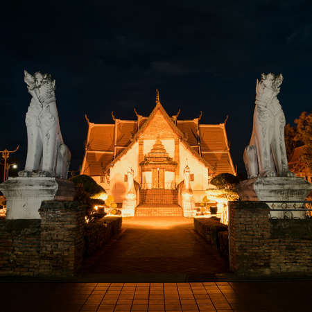 Main church of Wat Phu Mintr is very outstanding Northern style Thai art under twilight period sky