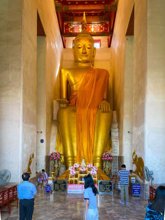 AYUTTHAYA, THAILAND - JUNE 28 2020: The beautiful big golden buddha statute at Wat Phanan Choeng Temple, many people come to pay respect to the buddha, Thailand. Ayutthaya is former capital of Siam (former Thailand).