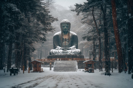 A serene and imposing bronze statue of Buddha sits amidst a snowy forest landscape, with snowflakes falling gently around it