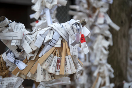 Osaka, Japan- 03 Dec, 2019: Closeup of Japanease Omikuji random fortunes paper tied to rope wire for good luck at Namba Yasaka Shrine in Osaka, Japan.