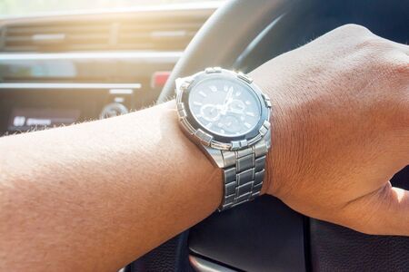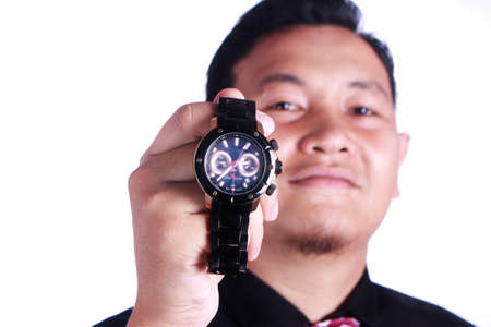 Portrait of young Asian businessman showing wristwatch, focus on watch with blurred face