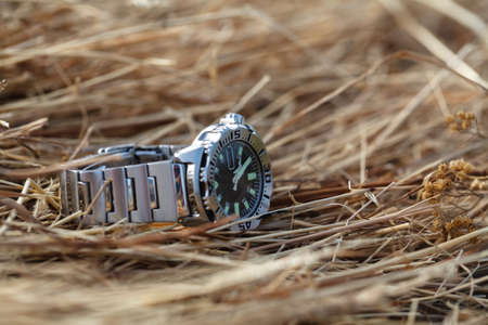 Classic men's watch with a leather strap showing five minutes to midnight. 5 minutes to twelve o'clock