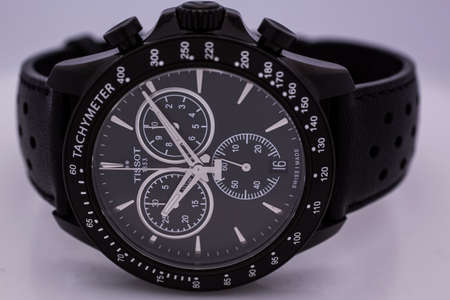 Le Locle, Switzerland 15.01.2020 - Tissot man watch stainless steel case, black clock face dial, leather strap, swiss quartz mechanical watch isolated, swiss made manufacture