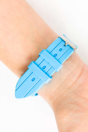 Blue silicone strap on the female wrist. Close-up.