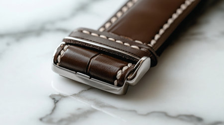 Close-up of a luxurious brown leather watch strap featuring fine stitching and a polished buckle resting on a smooth marble surface, showcasing elegance.