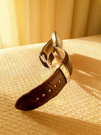Warm colors interior scene wrist watch over chouch