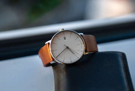 Classic wrist watch with white dial and classic brown wrist band on leather