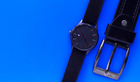 Wrist black watch and plaque from a black leather belt on a blue background. Mens Accessories. View from above. Place for text.