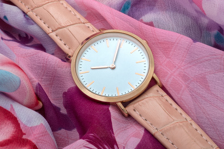 Pink band wrist watch on silk fabric background