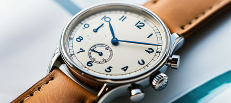 Stylish wristwatch with leather band indicating precise time, showcasing elegance and craftsmanship