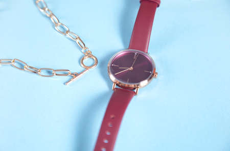Amazing analogue wrist watch isolated in elegant light blue background.