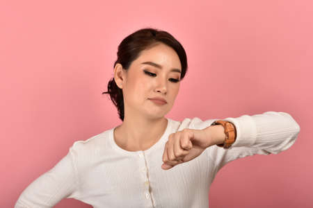 Angry and upset asian woman waiting for someone, Girl looking at wrist watch annoyed for late appointment, Time responsibility.