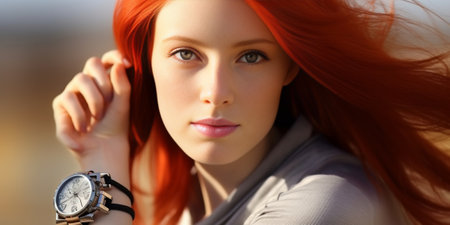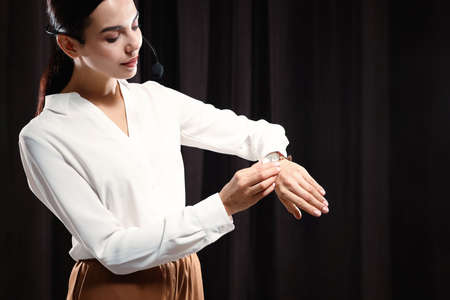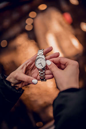 close up fashion details, young business woman holding her golden watch. graded in warm colors.