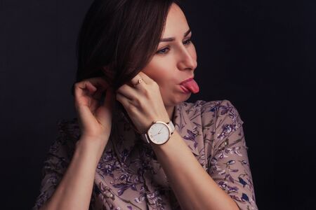 Photo woman with straight dark hair, posing in a shirt with painted flowers on dark background in Studio. fingers pulls the earlobe, shows tongue