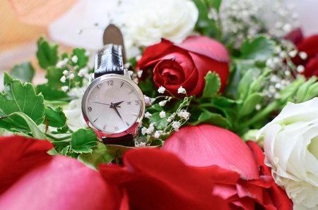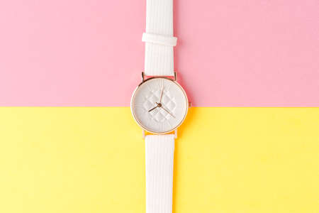 Stylish ladies watch on a colored background with flowers and place for text. Different colors clock