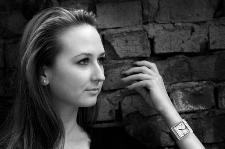 Beautiful white girl is waiting for someone outdoor, she is looking at her watch. Big roman numeral clock on the background