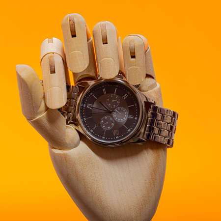 Wooden Hand with moden chronograph watch on an orange background