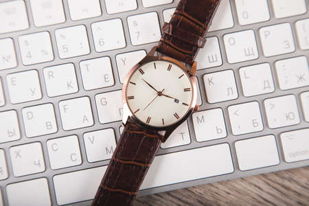 elegant watch on computer keyboard on table