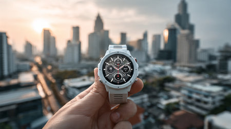 Hand holding a smart watch with blurred cityscape background, technology concept